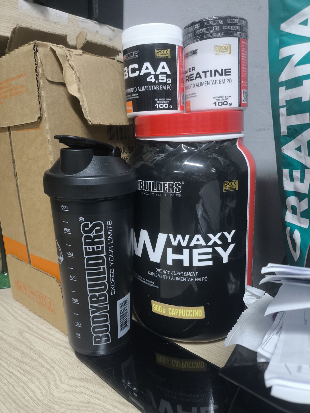 - Nome: Kit 2x Whey Protein Waxy Whey 900g + BCAA 100g + 2x Creatina 100g + Coq - Bodybuilders